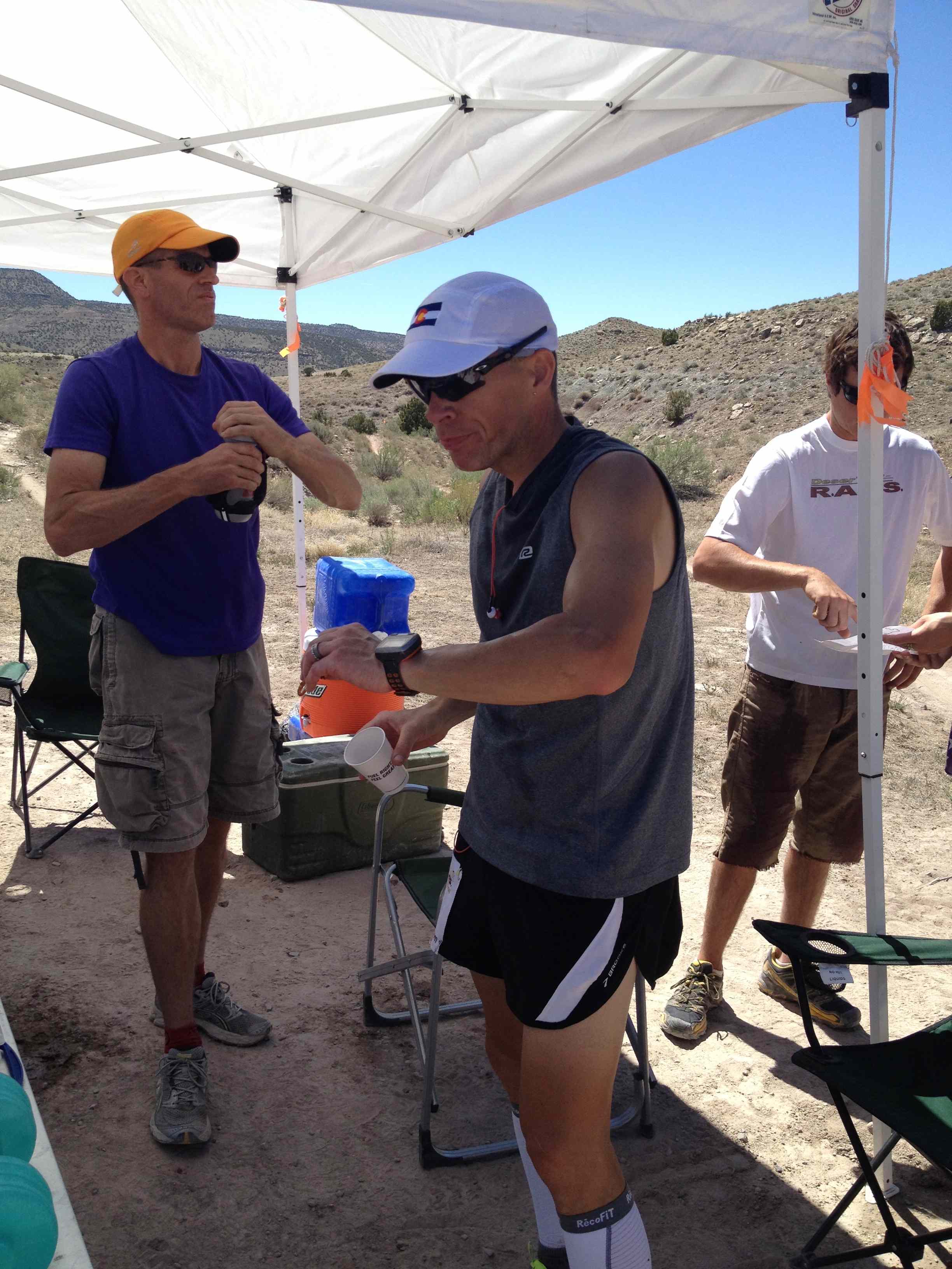 I was keeping up on my fluids and noticed with the temps I was hitting the aid stations at just the right time. I had made plans with my crew to pick up a second bottle to carry at the turn around. I knew with the heat coming I would need to double up the water/drink mix. I looked at my wife and said, “It’s all going by the script.” At the turn around I noticed that it wasn’t 25 miles…it was just a tick under 26 miles. Cool I thought-52 miles of racing couldn’t hurt…could it? What’s the difference? The difference would come into play later.