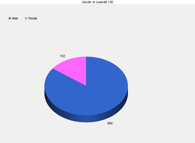 According to the race roster, as uploaded and published by Leadville Race Series, there are approximately 1,020 runners registered for the 2012 Leadville Trail 100. Of those runners, I identified approximately 152 female runners and 868 male runners. This provides an approximate ratio of (85%) male to (15%) female runners in this year’s race. I am not able to accurately calculate or predict the numbers of athletes that will not start the race, despite being currently registered. It is long established that many athletes will not toe the line due to injury, illness, or other individual reasons.